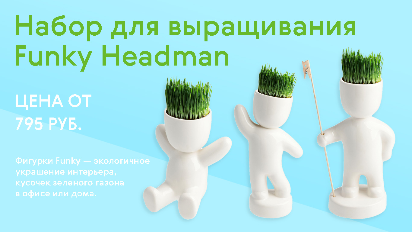 Фигурки Funky — экологичное украшение интерьера, кусочек зеленого газона в офисе или дома. Посадите волосы-травинки и наблюдайте, как меняется человечек. Вы можете сделать ему стильную стрижку, добавить настроения, нарисовав маркером лицо, — и поменять образ, когда трава снова подрастет.