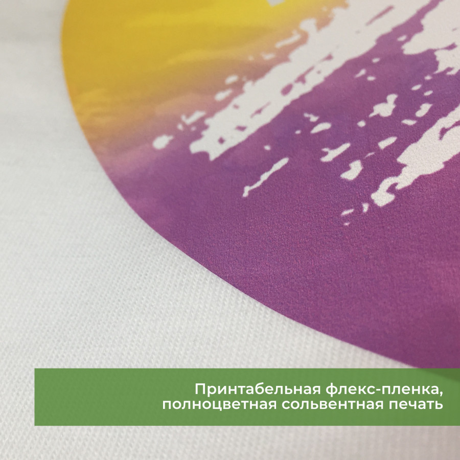 2) Флекс-пленка белая, цветная или с полноцветным изображением вырезается по контуру и переносится на текстиль под высокой температурой. Данная технология позволяет изготавливать штучные экземпляры или тиражи с переменными данными.